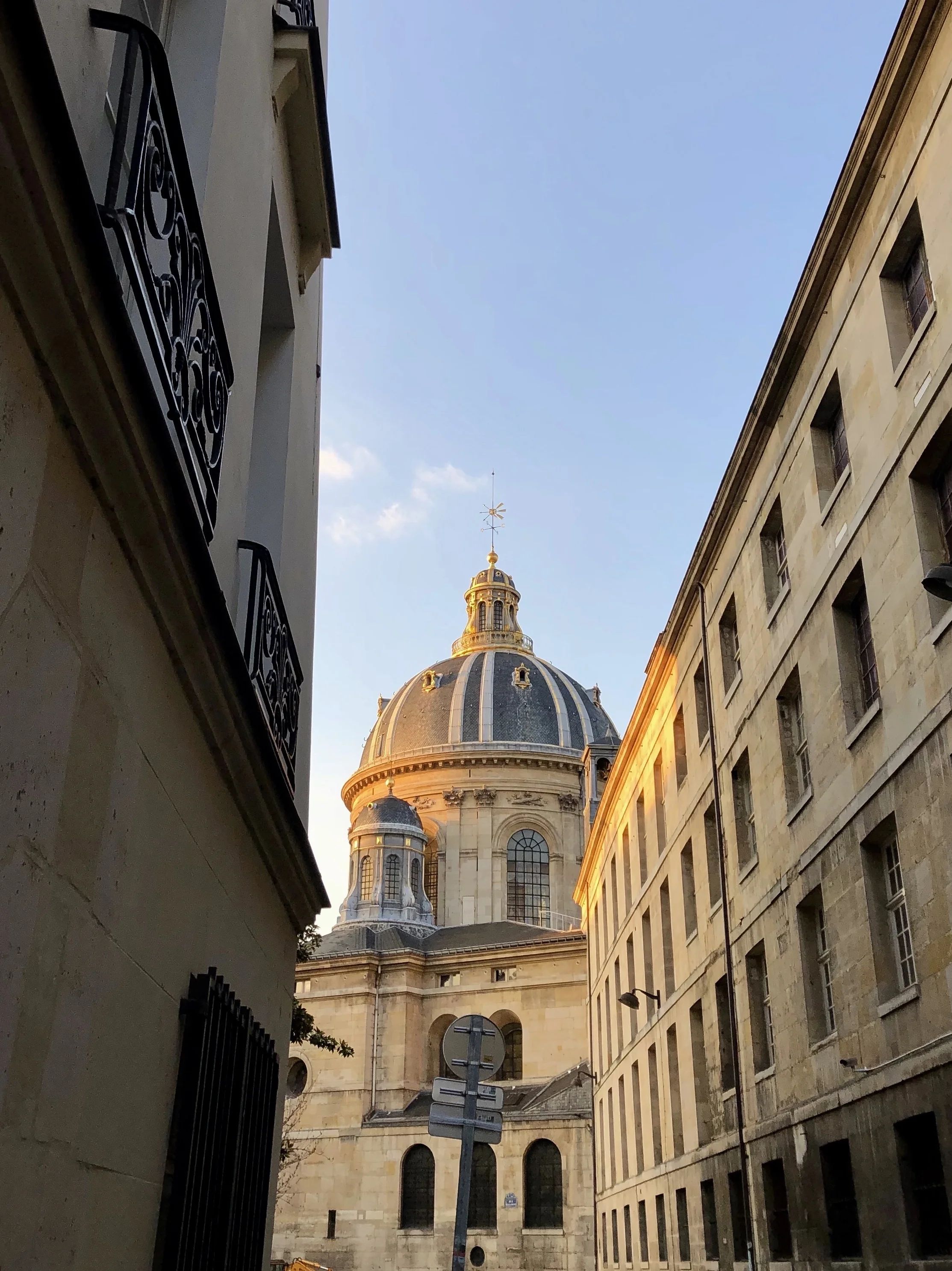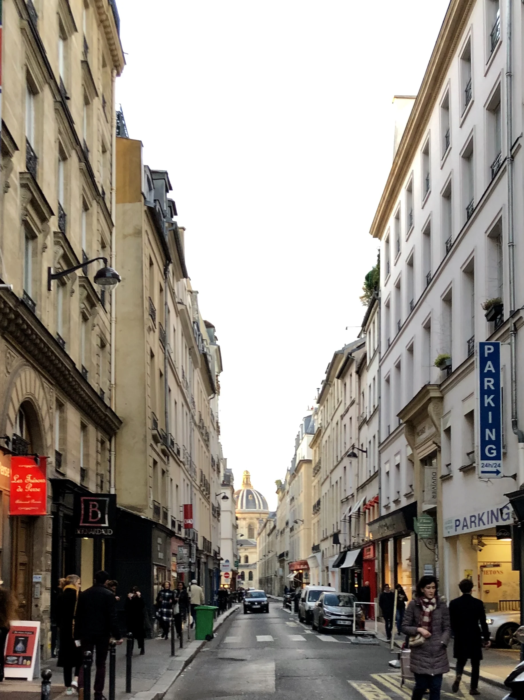 It’s late afternoon on a sunny day and the people on the crowded sidewalks seem collectively happy to be out, soaking in the rays of spring sunshine. As we hold our own, we look up and marvel at the sight of light hitting the stone buildings, and particularly the St. Germain-des-Prés Church, located right in our neighborhood. The architecture, the style, the lines of buildings around us reflect the old history of this city of light. It’s visible in the lampposts that come on as dusk arrives, in the variety of wooden doors opening into hidden courtyards, in the worn, narrow and uneven wooden steps that lead up to the third floor studio that we rent from Thierry every year. Every trip out the door is an excursion into a world full of the unexpected. This stone arch takes us on a slanting cobblestone lane to the next street. This dark street opens out onto a square with a small park where a bird sits on a blooming branch singing a song of spring. David Bowie beckons to us from this artfully arranged window. And off the main boulevard, the sound of voices takes over the sound of traffic.