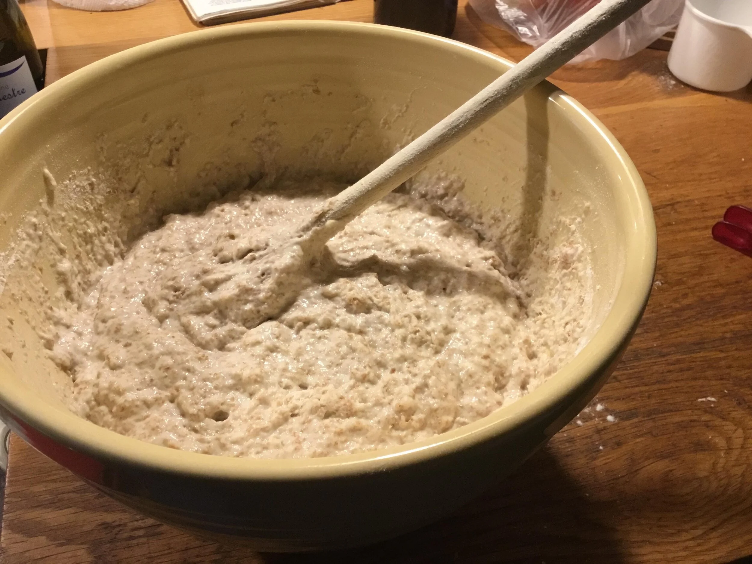 Mix the flours in a large stoneware bread bowl. Stir in the water until it is totally mixed in. Let sit for 30 minutes, covered with a damp towel.