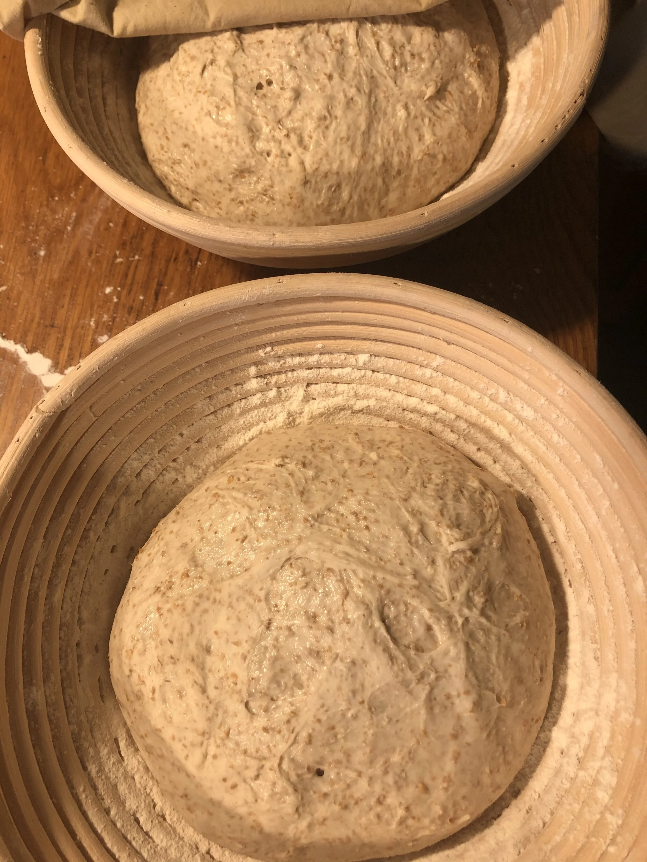 Then turn out onto a lightly floured counter. Gently shape the dough into a ball. Cut into two pieces. Shape each piece into a round loaf. Then place with the bottom side up into a floured banneton or a flour sprinkled towel-lined basket. Cover with a damp towel and allow to rise 45 minutes.
