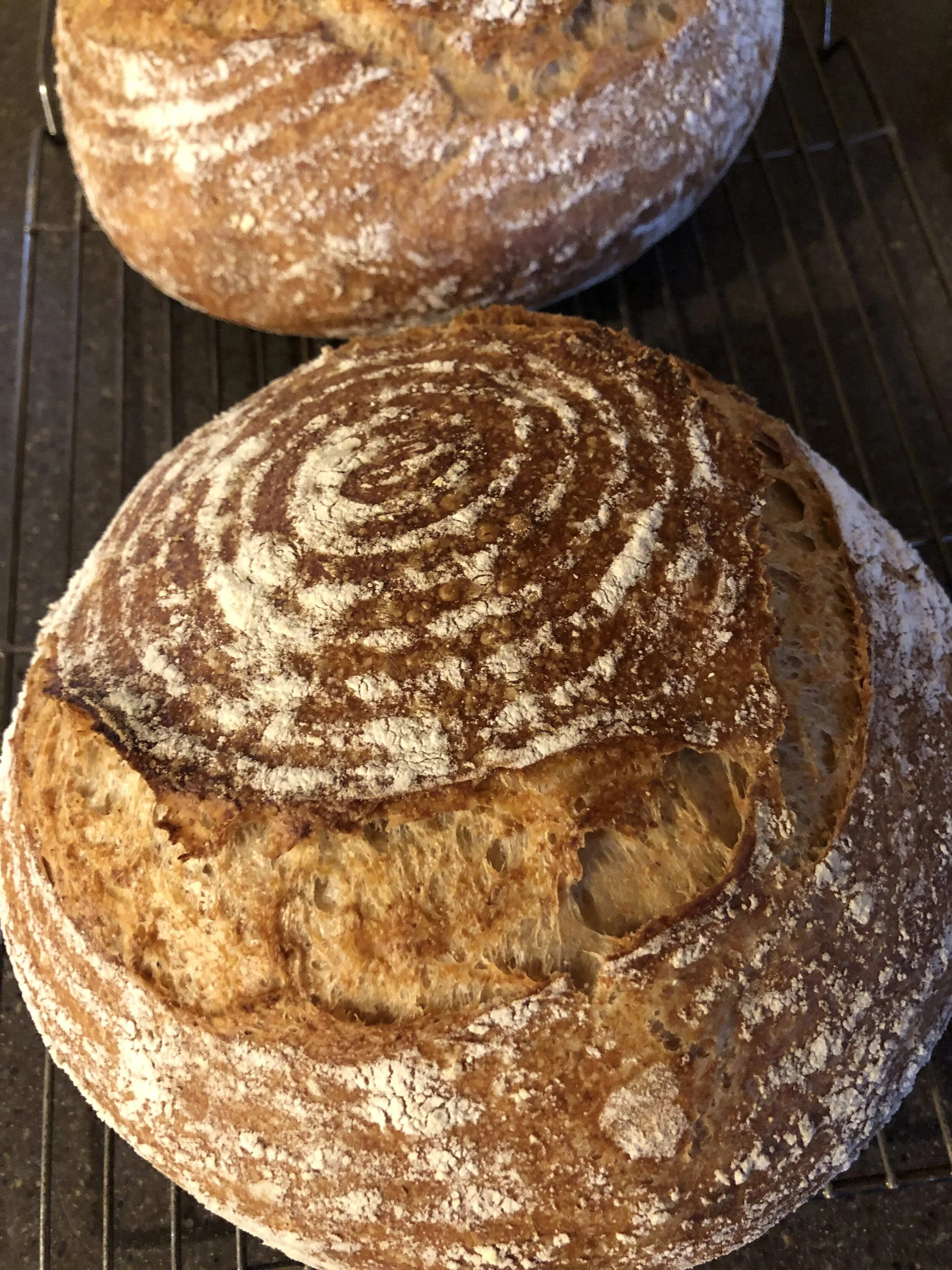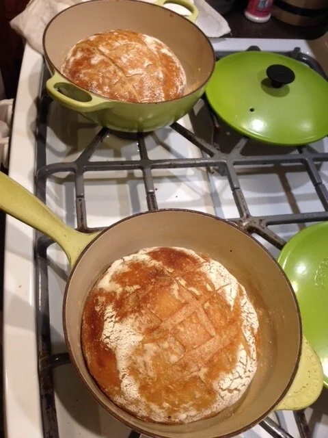 Bake for 20-25 minutes then remove the lids and then rotate the pots in the oven. Bake for another 20 to 25 minutes. Turn the loaves out onto a cooling rack. And thump the bottom to make sure they sound hollow. They should be done.